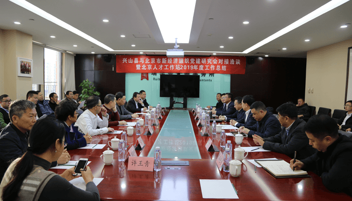 2019年12月21日 ,湖北兴山县与北京市新经济组织党建研究会对接洽谈暨北京人才工作站年度总结会议在瑞华会计师事务所举行。兴山县委副书记、县长曹宏伟,兴山县委常委、组织部部长、统战部部长郑书香,兴山县副县长杨四龙以及兴山有关部门负责同志、兴山北京人才工作站有关同志出席会议。北京市新经济组织党建研究会会长、瑞华集团董事长杨剑涛,副会长兼秘书长王晓辉等出席会议,郑书香主持会议。