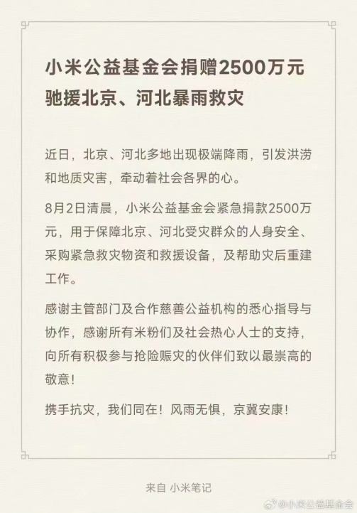 小米公益基金会宣布紧急捐款 2500 万元,用于保障北京、河北受灾群众的人身安全、采购紧急救灾物资和救援设备,及帮助灾后重建工作。